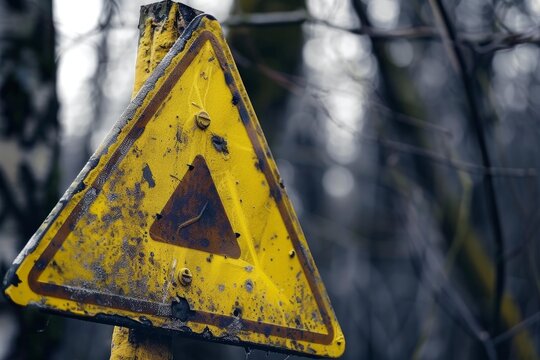 Grungy triangular warning sign covered in dirt and rust, indicating potential danger in a forest environment
