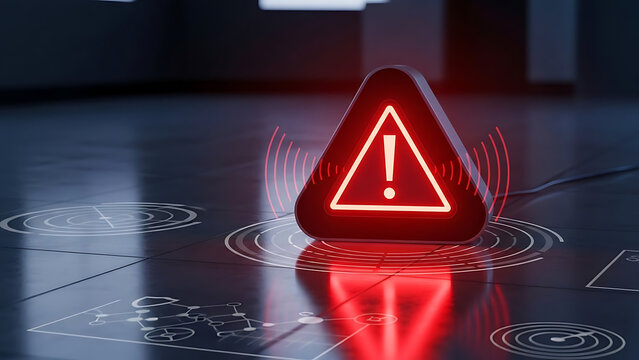 A vibrant red triangular warning sign with a white exclamation point is prominently displayed on a reflective surface