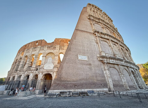 VATICAN CITY, ROME, ITALY - AUGUST 02, 2025 view of the Colosseum from behind. The ancient arena's weathered stone and brick and a triangular buttress supports the crumbling structure
