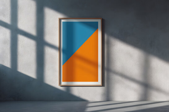Minimalist wall art frame mockup with orange and blue triangular shape on the right side, displayed against a gray background in a studio setting to support modern interior design, branding visuals