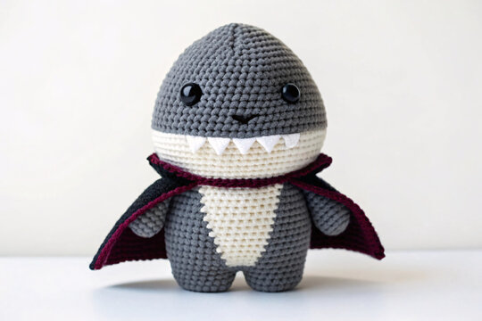 Cute crocheted shark character wearing dark cape with burgundy trim, featuring white belly with triangular teeth pattern and friendly black button eyes.