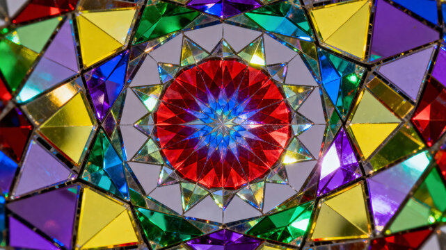 Colorful geometric mosaic with central red star pattern and reflective triangular tiles