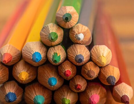 Close-up of colored pencils arranged in a partially visible triangular formation, showcasing diverse tips against a blurred backdrop