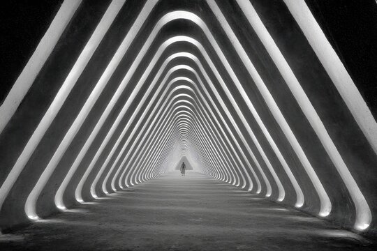 Interior view of a geometric tunnel structure with triangular facets and bright light