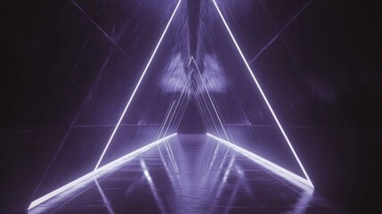 Radiant triangular neon tunnel perspective glowing in endless darkness