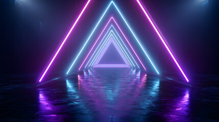 Immerse yourself in a vibrant neon tunnel with glowing triangular light formations reflecting on a wet, dark floor, creating a futuristic and energetic atmosphere.