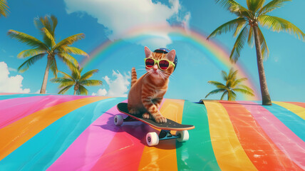 Cat riding skateboard on colorful background