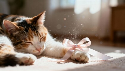 Calico cat sleeping peacefully on carpet with soft pink ribbon on paw