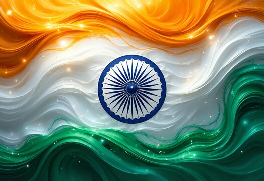 Abstract artistic representation of the Indian flag with flowing tricolor waves and central chakra