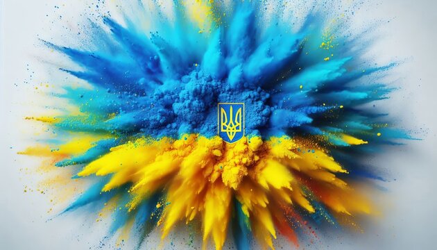 Ukrainian abstract colorful flag holi paint powder explosion of blue and yellow. In the center is a trident - the national emblem of Ukraine. Ukrainian flag is the national symbol of Ukraine