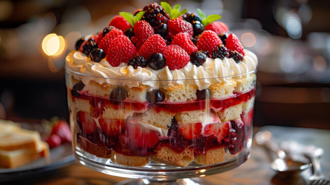 A trifle dessert with berries and cream in a bowl