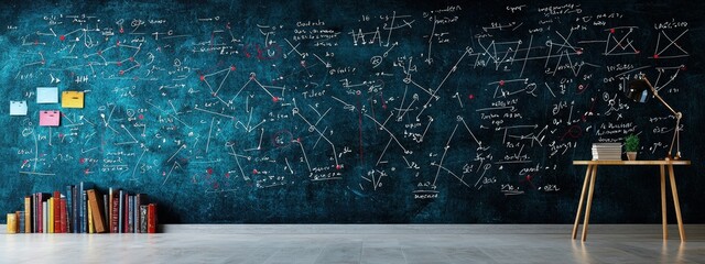 Chalkboard filled with math equations and trigonometric diagrams in classroom
