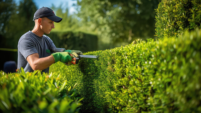 Sunny day, professional gardener trimming a hedge, cut green bushes near the house.
