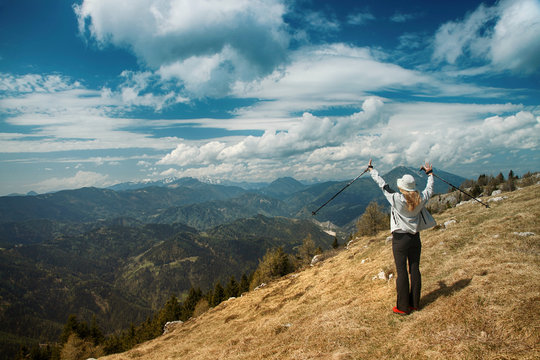Happy woman on top of the hill with sunny and cloudy sky background.