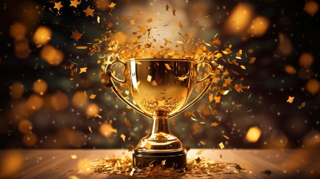 Golden trophy with confetti background celebrating victory