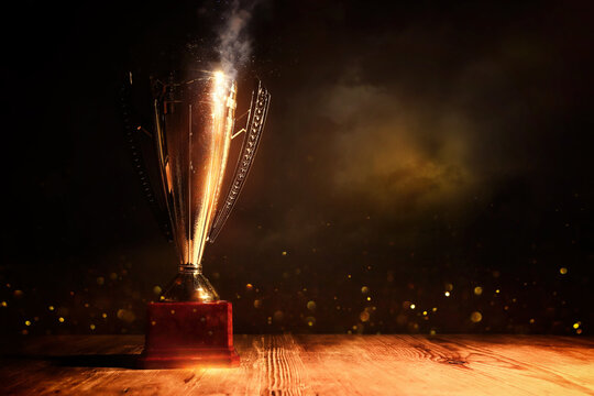 Shining ornate gold trophy reflecting vibrant bokeh on glossy tabletop for celebration