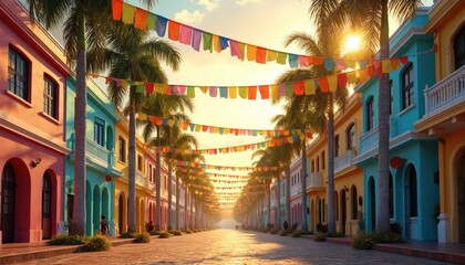 A vibrant street scene featuring brightly colored residential buildings with tropical palm trees in the background under a clear sky