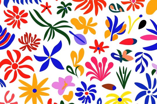 A Colorful Abstract Floral and Leaf Pattern Design Featuring Various Shapes and Botanical Elements