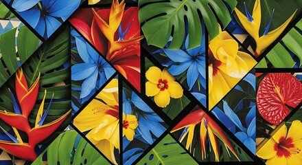 Vibrant abstract mosaic of exotic tropical flowers and jungle leaves in a colorful geometric design