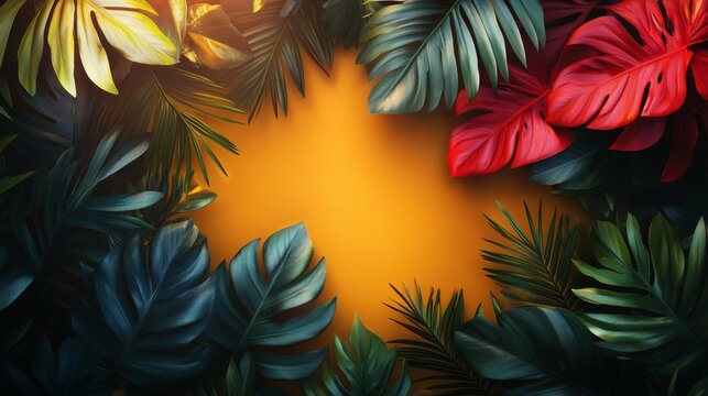 Tropical Leaves Frame on Vibrant Orange Background. Generative AI