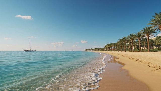 Palm-lined tropical beach with turquoise water, sailboats on horizon, resort promenade