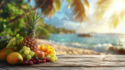 Assorted tropical fruits on a wooden table with a beach background