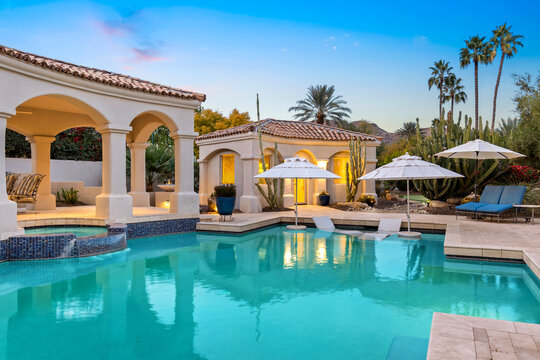Candid shot of young caucasian couple lounging in modern chair near luxurious pool of tropical hotel and spa in Bali