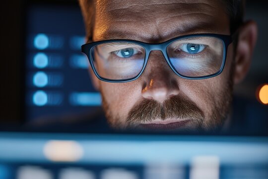 Cybersecurity expert wearing glasses deeply focused on a glowing laptop screen in a dimly lit office. The background shows graphs and encrypted data, highlighting a secure tech environment