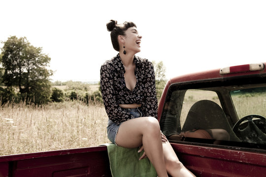 A sunlit, empty pickup truck bed with a vast field stretching into the horizon, creating a rustic and open feel.