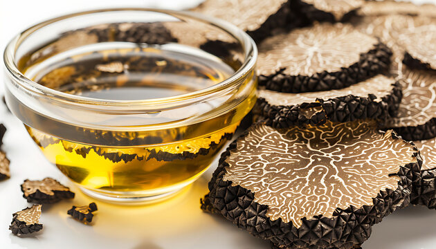 Close-up of black truffle slices and golden truffle oil in a glass bowl on a white background, highlighting luxury and gourmet appeal