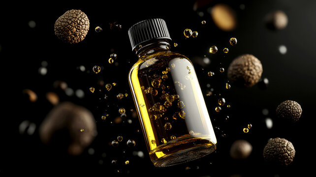 A bottle of truffle oil with floating truffles and oil droplets against a dark background, highlighting luxury and gourmet essence.