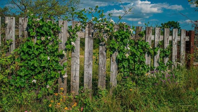 Weathered wooden fence draped in climbing vines and wildflowers in rural meadow