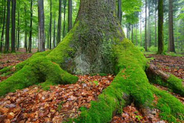 Snow falling through tall pine trunks in moody conifer forest with misty winter atmosphere