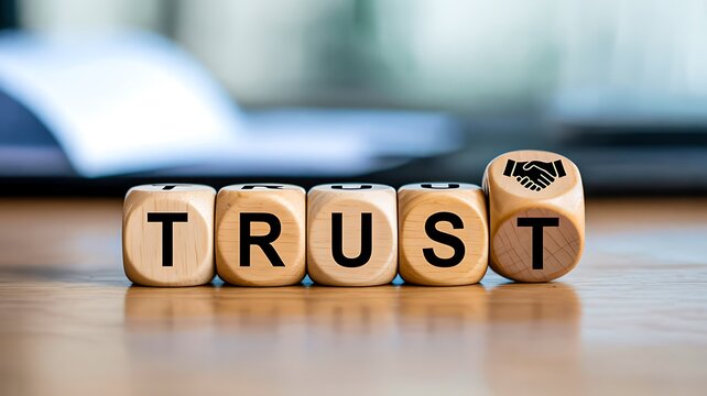 Business partnership concept. Trust icon wooden block placed on top of structured people blocks, representing leadership trust hierarchy and organizational unity.