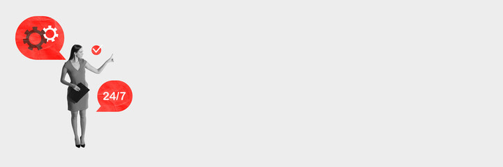 Young woman working in supporting center, fixing problems. E-support. Online service. Contemporary art collage. Concept of support, office, call center, hot line, profession, communication