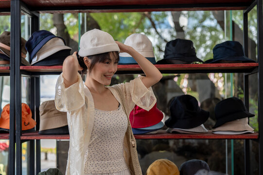 A beautiful Asian woman is trying on a hat in a hat shop, enjoying her shopping spree on the weekend