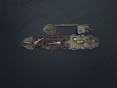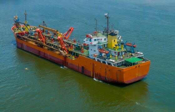 Aerial drone shot of a TSHD dredger operating at sea, removing sediment from the seabed for harbor dredging and coastal construction