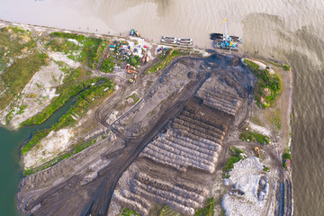 Bulk territories on the shore of the sea bay, dumping of soil artificial island aerial top view.