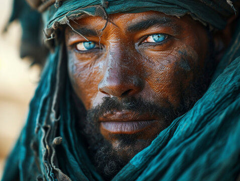 Portrait of a tuareg man with traditional blue turban in the desert