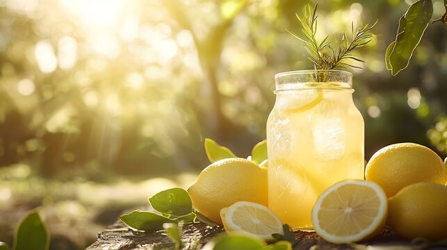Bush tucker lemonade lemon myrtle bright sunlight highlighting vibrant ingredients and outdoorsy vibe outdoor setting backdrop 50mm lens fresh lemonade shot
