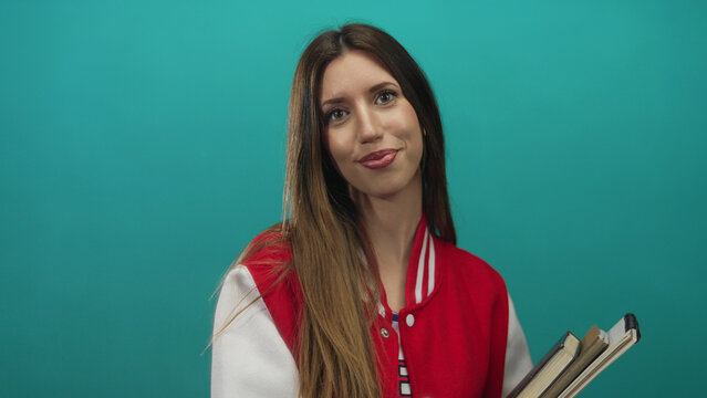 Woman in red and white varsity jacket holds textbooks and tucks hair behind ear in studio; school pride joy.