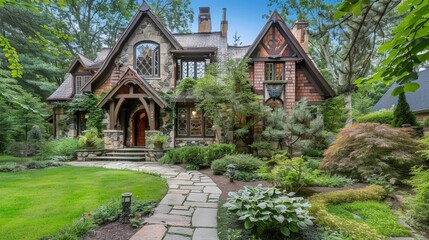 Imagine a Tudor-style house with exposed wooden beams, leaded glass windows, and a steeply pitched roof.