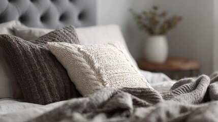 Close-up of a bed with two pillows on it. the pillows are knitted in a light grey color and have a cable knit pattern. the bed has a gray tufted headboard and white sheets.