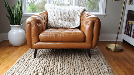 Cozy tufted sofa with warm knit blankets in ambient living room