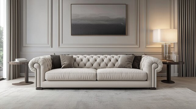 Luxurious yellow button-tufted sofa with pillows, lamp, dark background