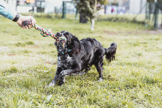 Beautiful black dog is pulling a tug toy with his owner. Playing in the park