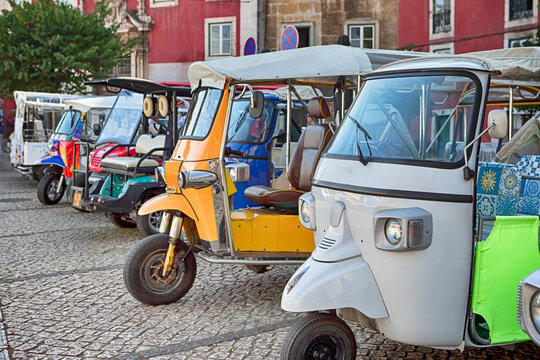 Portugal Travel Ideas. Tuk Tuk in Streets of Lisbon in Portugal as Public Mean of Transport in Open-Air City For Holidays Tourist Destinations