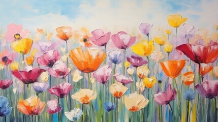 Spring summer tulips flower background banner panorama - Abstract oil acrylic painting of colorful tulip field on canvas, Generative AI