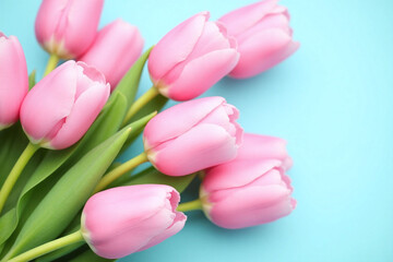 Tulip border with copy space. Beautiful frame composition of spring flowers. Bouquet of pink tulips flowers on turquoise blue vintage wooden background