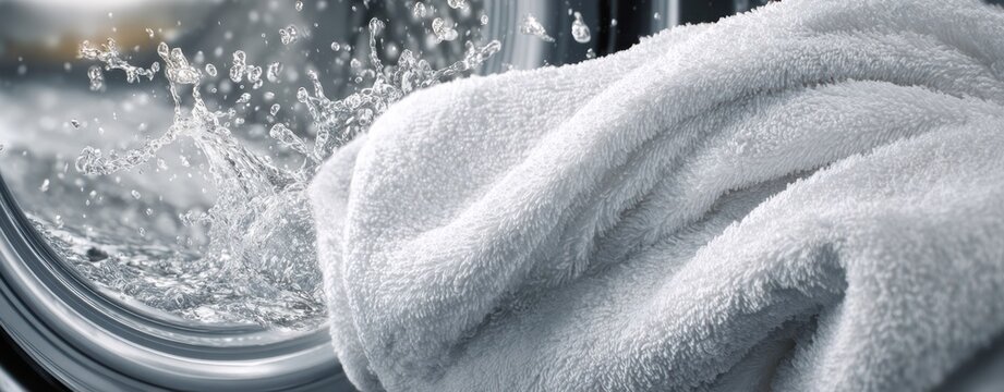 Close up view of white laundry in a modern washing machine drum.